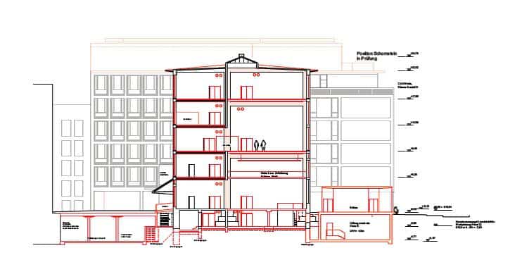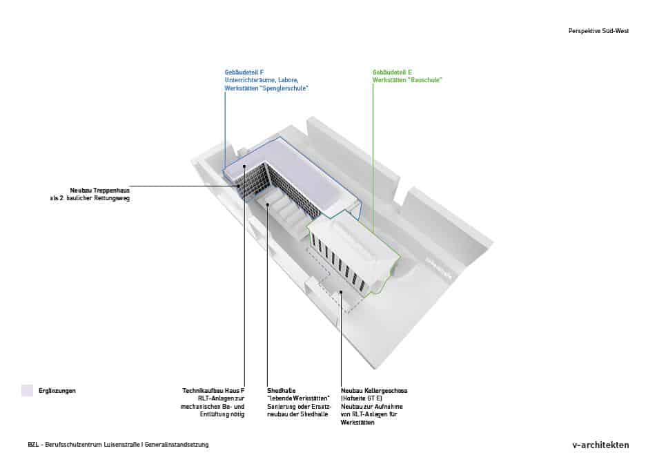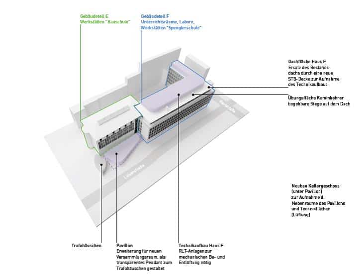 Im Rahmen der “Schulbauoffensive” der Stadt München wurde nun nach Jahren der Planung und Suche nach Ausweichquartieren für die betroffenen Schulen (unsere Schule bezog die Praxishallen in Aubing zum SJ 2018/19) tatsächlich mit den Arbeiten begonnen, die sich ca. fünf Jahre hinziehen werden. Aktuell soll zum Schuljahresbeginn 2023/24 feierlich der Wiedereinzug begangen werden. Neben der Sanierung der Gebäudeteile werden zusätzlich eine Aula für Veranstaltung auf Seite der Luisenstraße als auch ein Keller unter dem Innenhof errichtet.