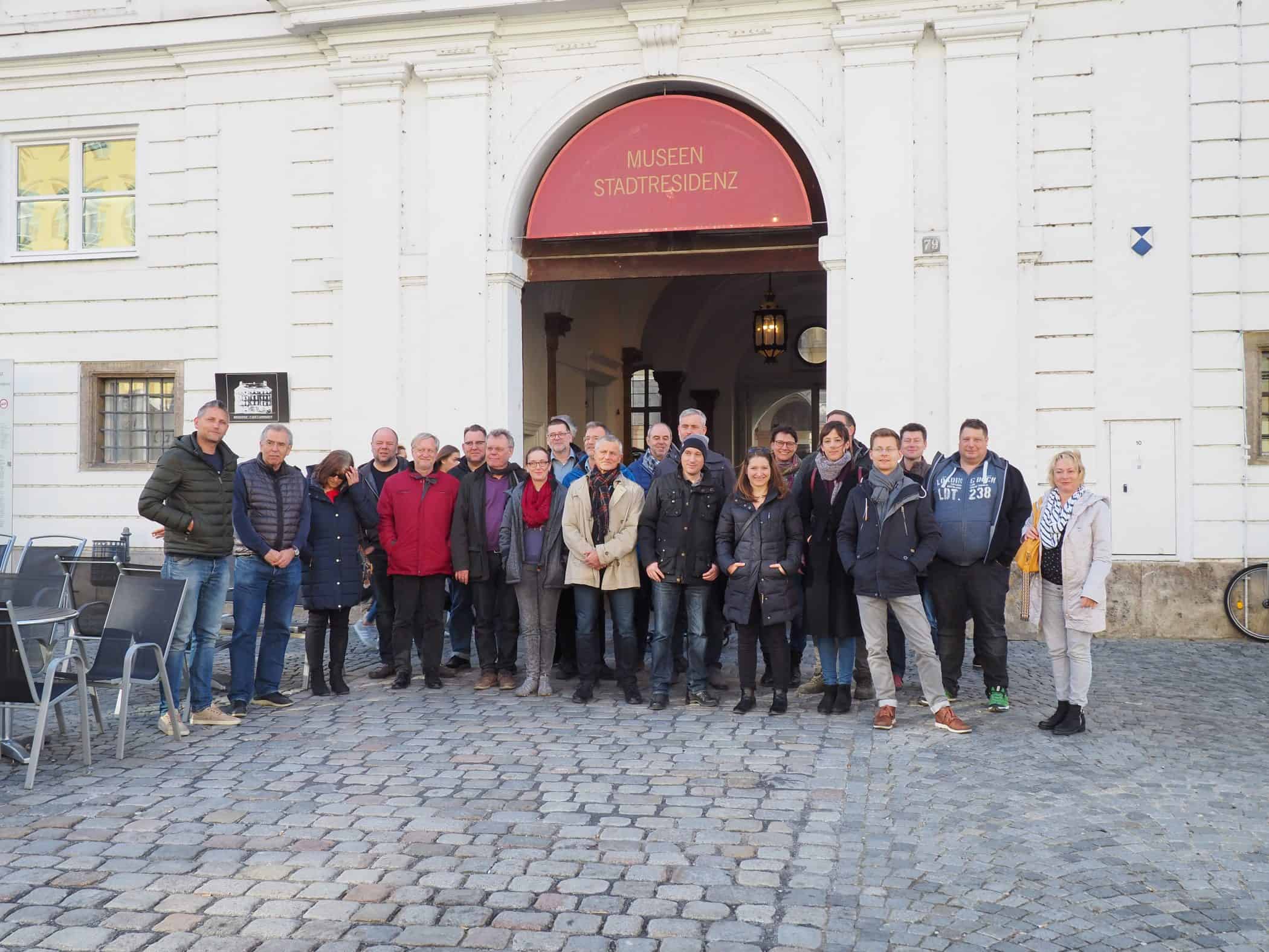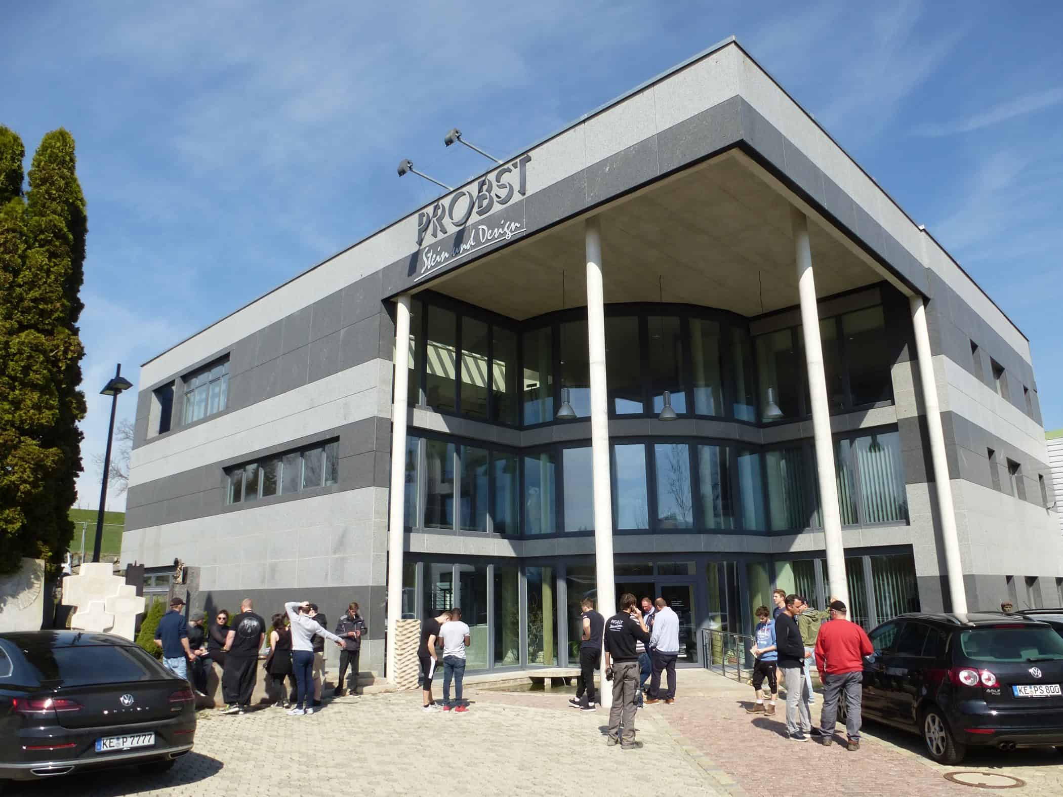 Gleich die erste Station auf dieser Fahrt gab die Richtung für die nächsten drei Tage vor: Der Steinmetzbetrieb Probst in Kempten demonstrierte, dass die Tätigkeiten eines erfolgreichen Unternehmens nicht lokal begrenzt sind, sondern europaweit erfolgen und das traditionelles Steinmetzhandwerk und hochmoderne Fertigungsmethoden zu unserem Beruf gehören. So lag ein 25-Tonnen Steinkoloss zur Bearbeitung im Arbeitszentrum. Der Stein kommt aus Skandinavien. Durch digital gesteuerte und handwerkliche Bearbeitung entsteht ein Brunnen, der danach in einem schwedischen Schlossgarten aufgestellt wird.
