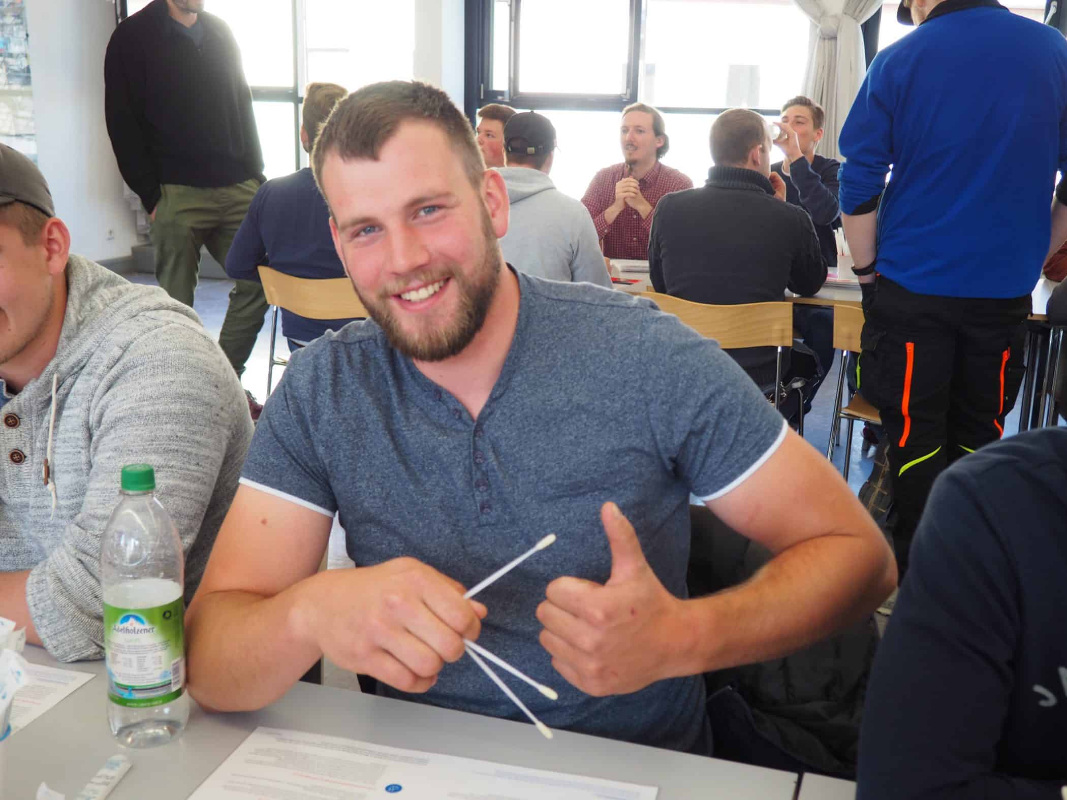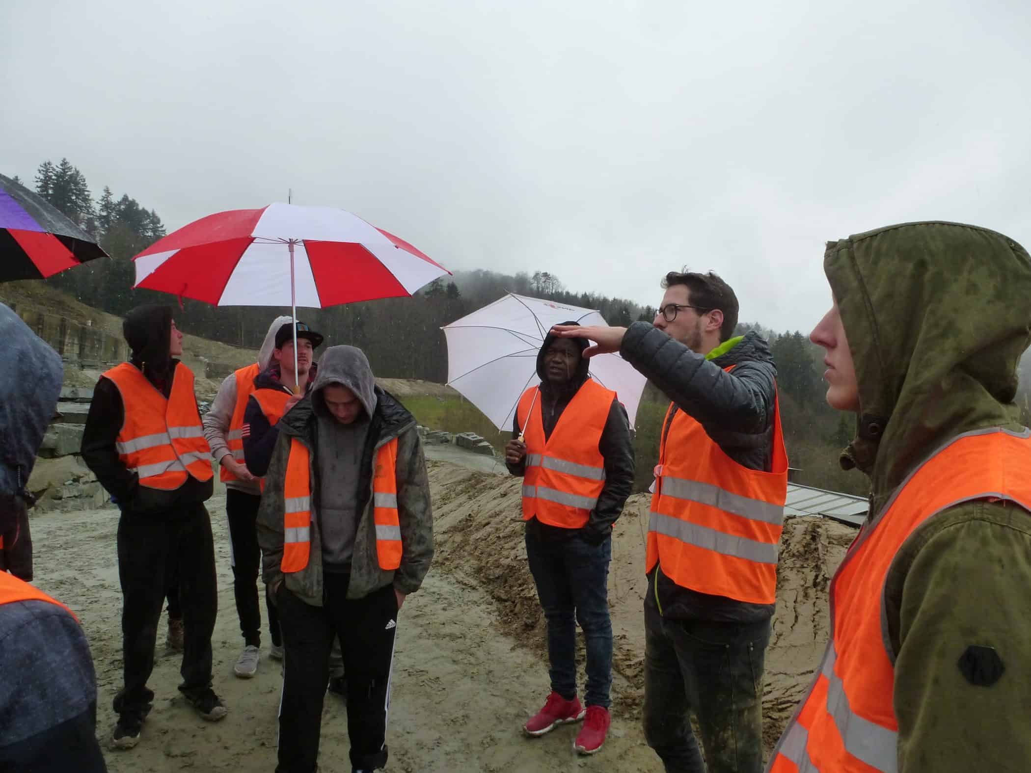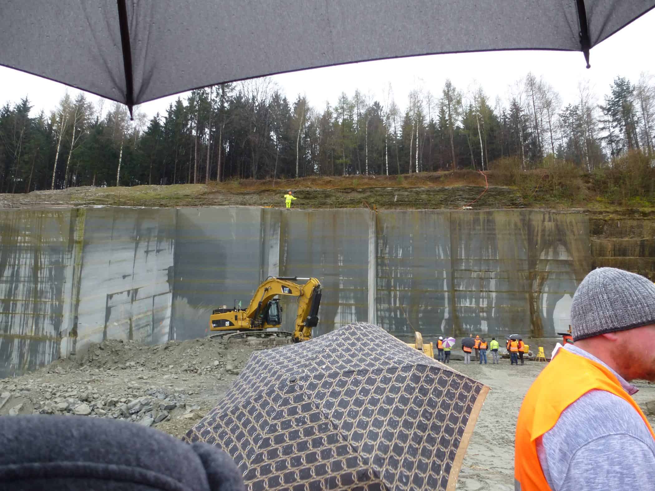 „Rohrschacher Grünsandstein“, der allgegenwärtige Naturstein rund um den Bodensee, kommt zum großen Teil aus dem Steinbruch des Familienunternehmens Bärlocher bei Rohrschach. Christian Bärlocher, begeisterter Steinmetz, Architekt und zukünftiger Chef des erfolgreichen Betriebes, führte uns trotz Schneeregen am Nachmittag durch den Steinbruch und erklärte vor der mehr als 10 Meter hohen Natursteinwand die Geologie und Gewinnung des Steins. Der Abbau erfolgt unter anderem mit einer speziellen Seilsäge, die gleichzeitig material- und dadurch auch umweltschonend arbeitet.